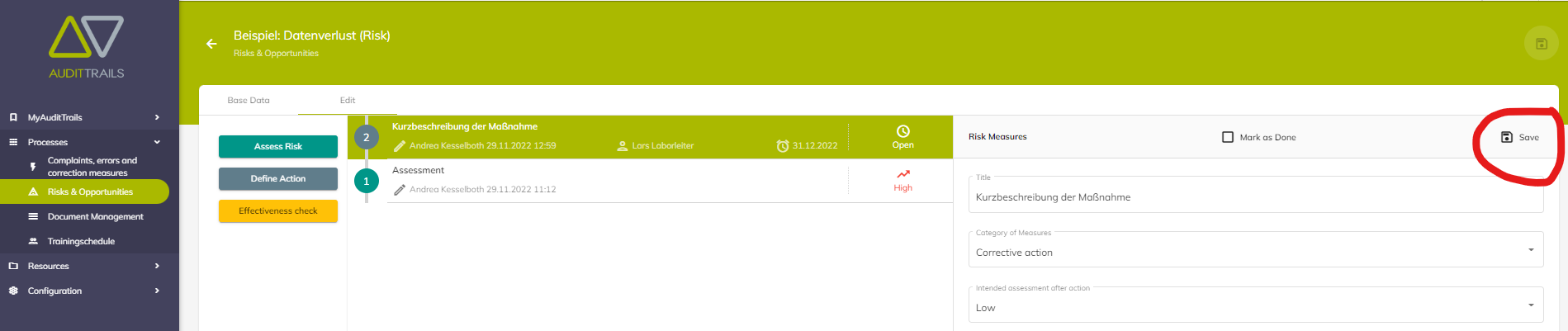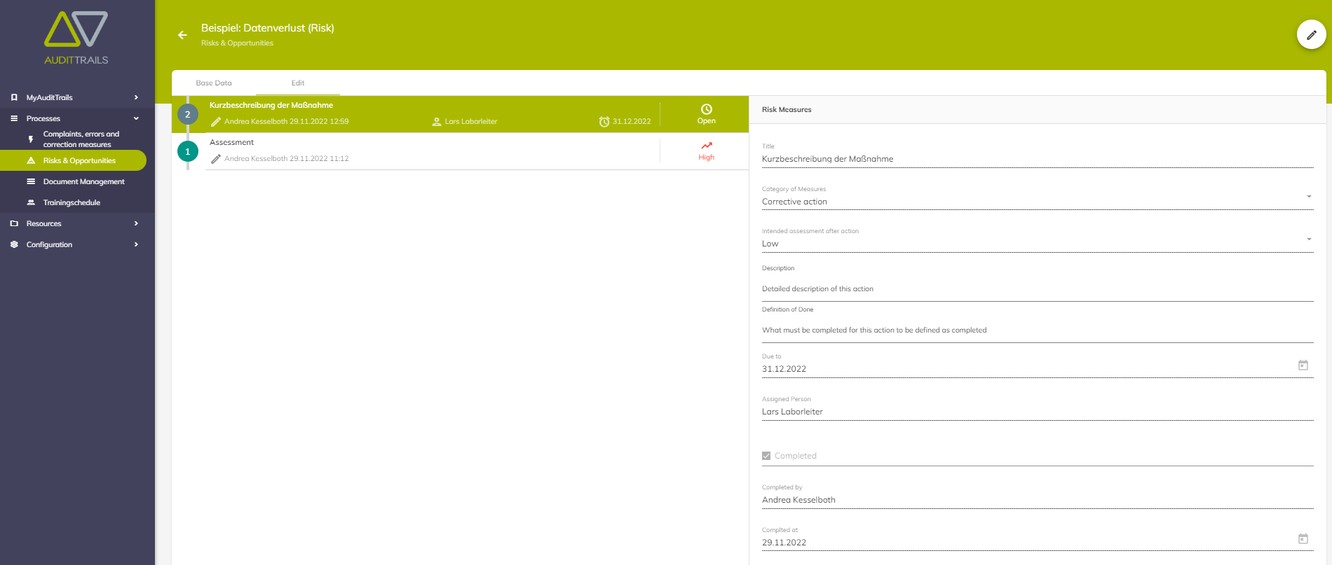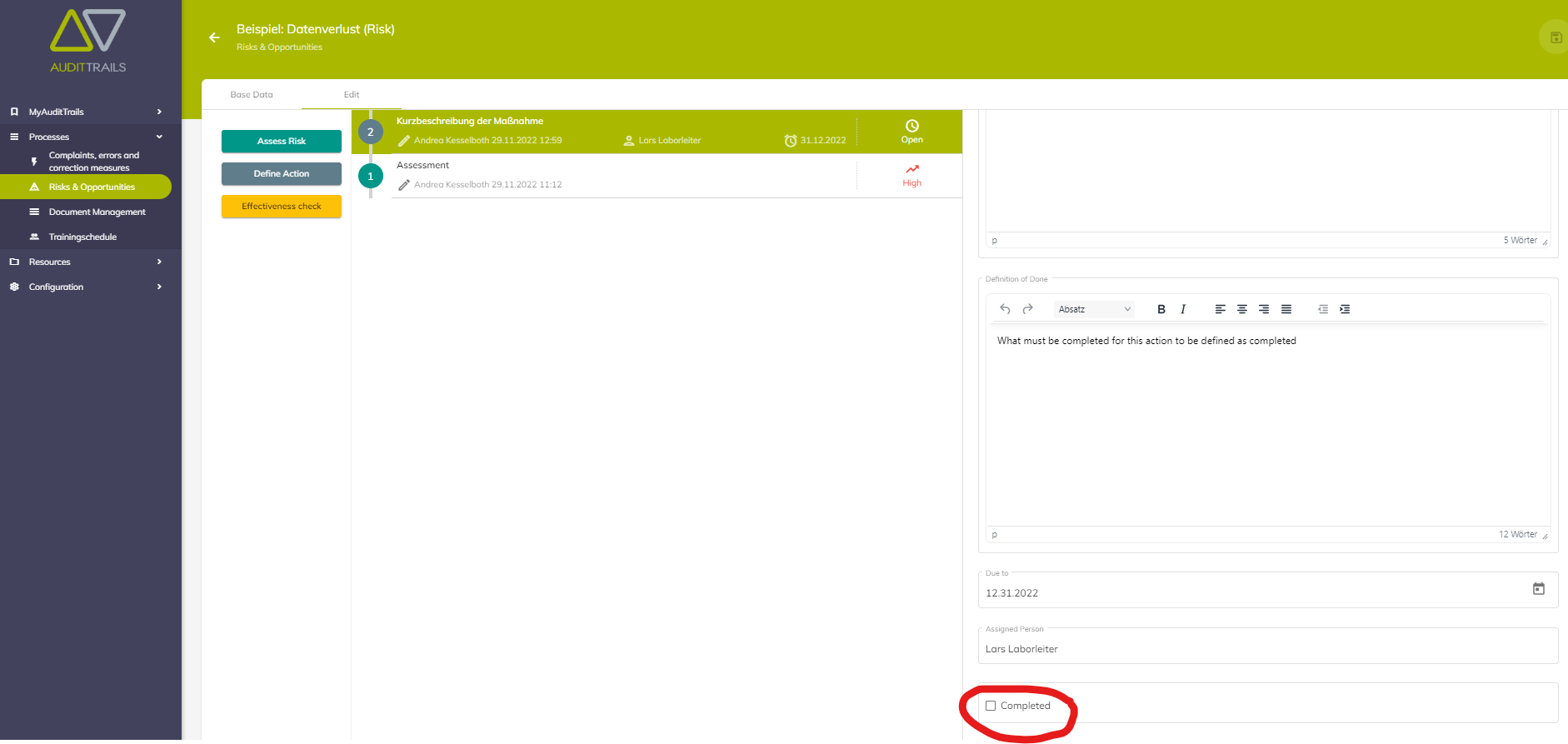If the points in the action are implemented and completed, the responsible employee can enter this in the action.