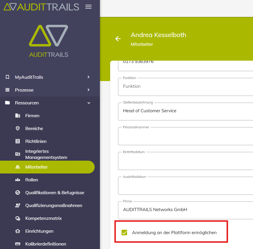 Hat ein Mitarbeiter das Unternehmen verlassen muss in der Plattform AUDITTRAILS im Modul Mitarbeiter für den konkreten Mitarbeiter das Häkchen entfernt werden "Anmeldung an der Plattform ermöglichen"