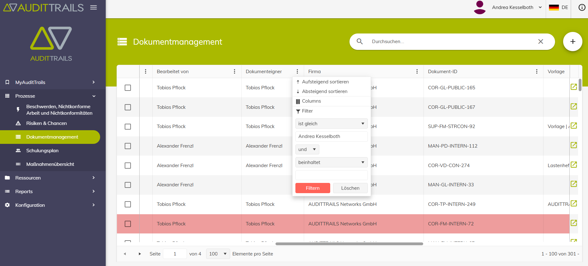 Dazu im Modul Dokumentmanagement die Filterfunktion in der Spalte Dokumenteigner nutzen.