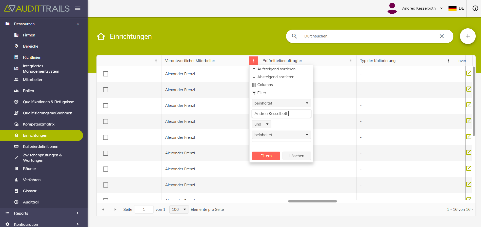 Dazu im Modul Einrichtungen die Filterfunktion in der Spalte Prüfmittelbeauftragter und / oder verantwortlicher Mitarbeiter nutzen.