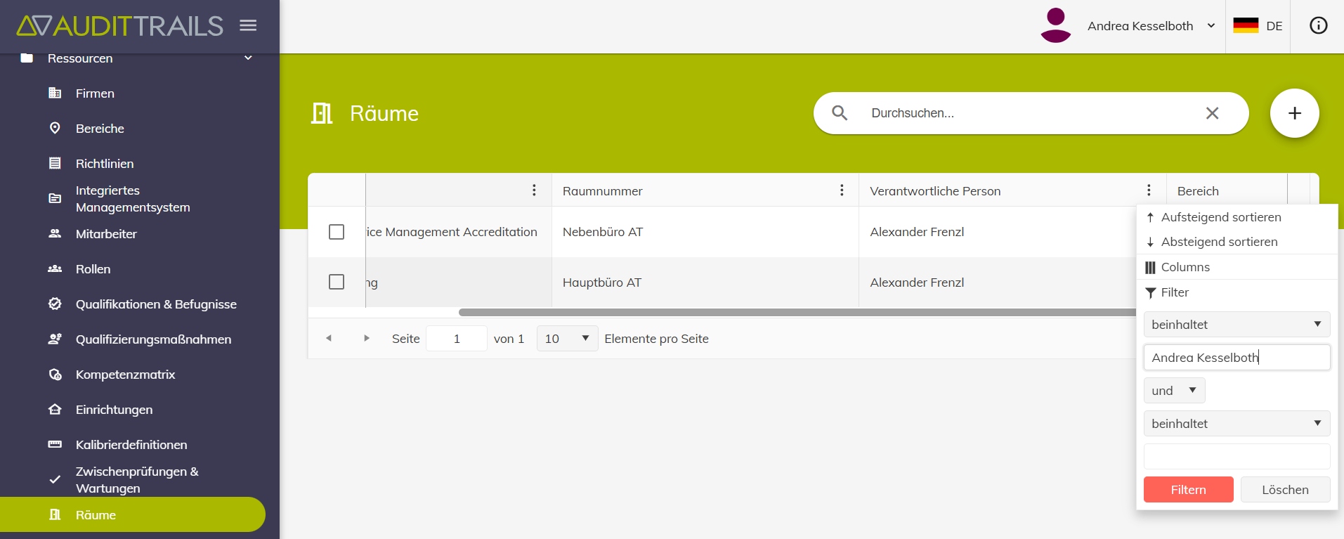 Dazu im Modul Räume die Filterfunktion in der Spalte Verantwortliche Person nutzen.