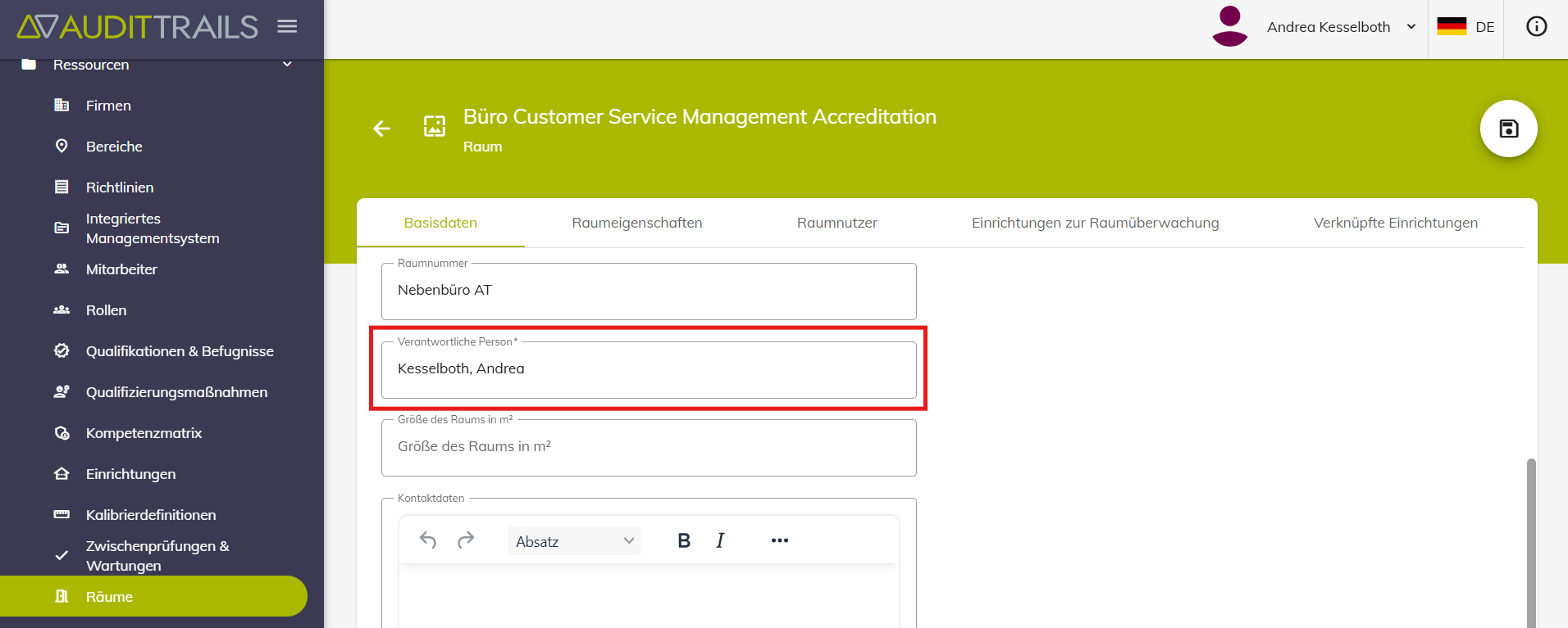 Anschließend in den Basisdaten des Raums die verantwortliche Person ändern.