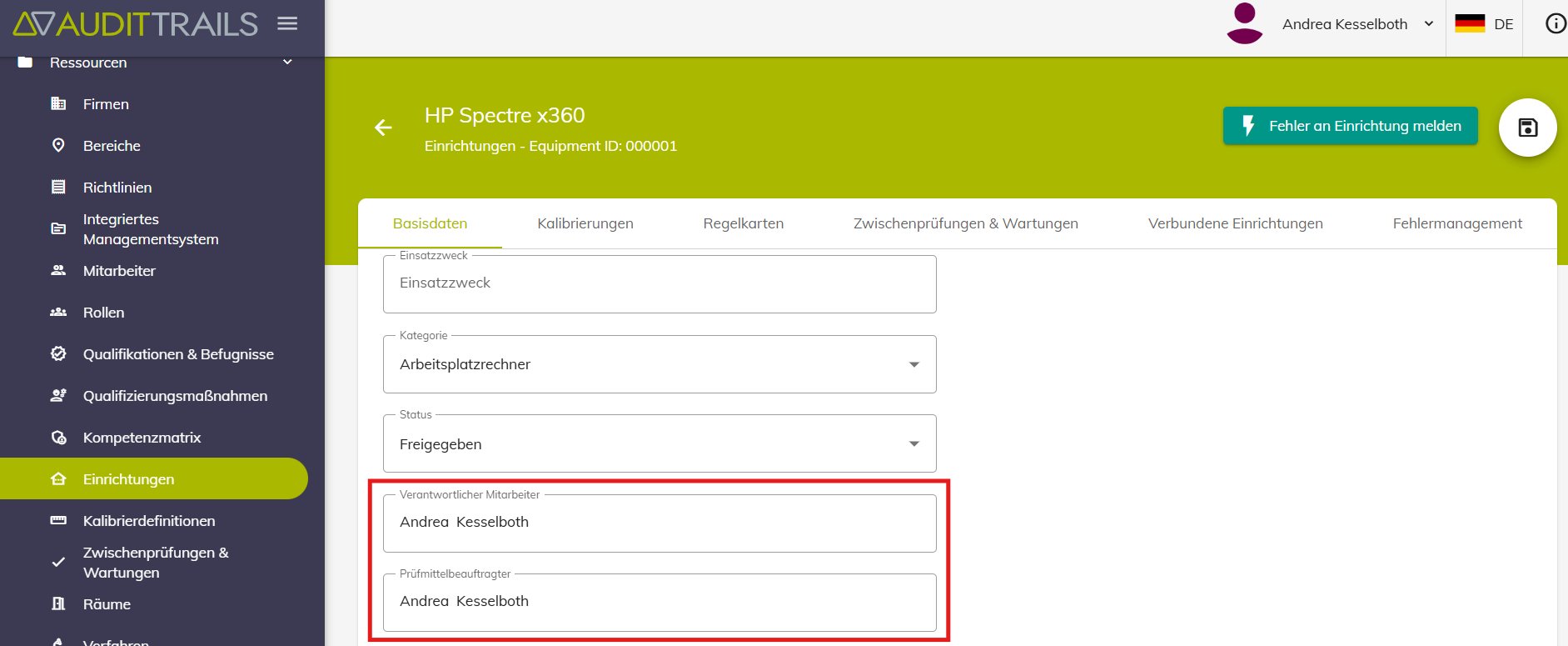 Anschließend in den Basisdaten der Einrichtung den Prüfmittelbeauftragten und / oder den verantwortlichen Mitarbeiter ändern.