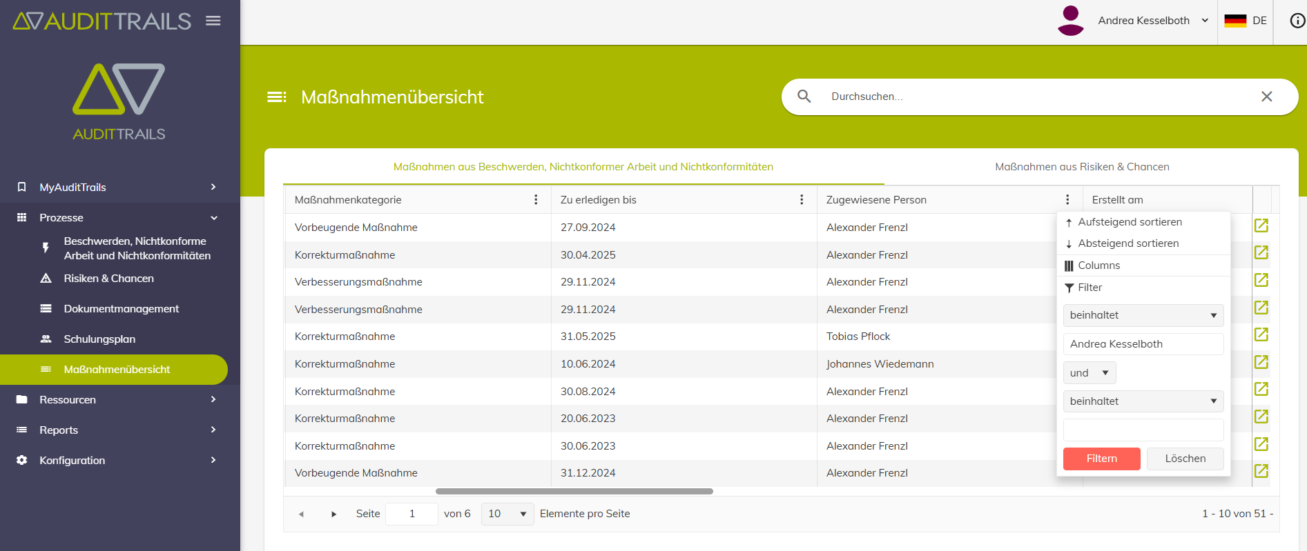 Im Modul Maßnahmenübersicht im Reiter Beschwerden, Nichtkonforme Arbeit und Nichtkonformitäten erhält eine berechtigte Person einen Überblick über alle Maßnahmen. Hier kann in der Spalte Zugewiesene Person nach dem Namen des verlassenden Mitarbeiters gefiltert werden.
