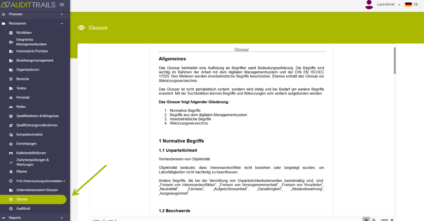 AUDITTRAILS bietet die Möglichkeit mittels Glossar ein Verzeichnis mit eigenen Begriffserklärungen und Abkürzungen zu erstellen. Dieses wird im linken Navigationsbaum unter „Ressourcen“ à „Glossar“ angezeigt und ist dort aufrufbar.